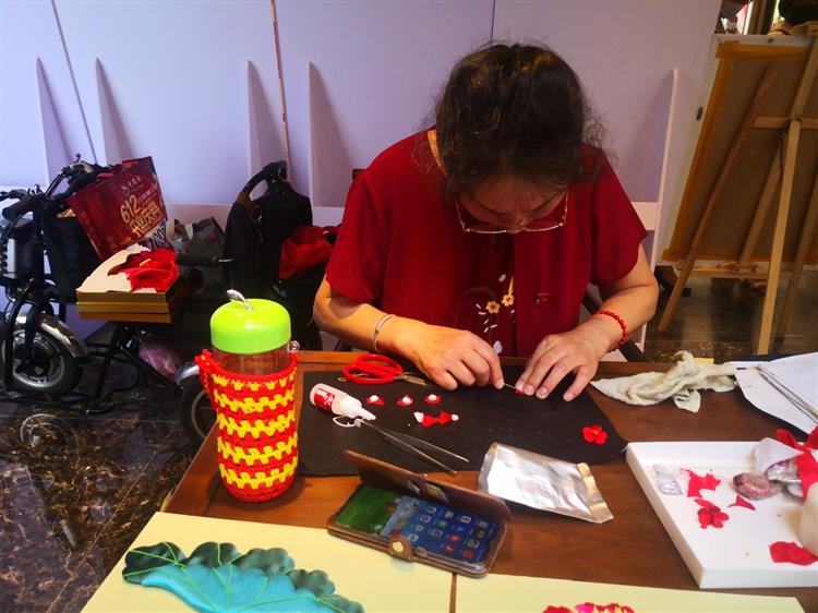 作品展涵盖了多种艺术门类,有剪纸、书法、油画、串珠、摄影、扎染等。身残志坚的残疾人艺术家们用自己高超的智慧、勤劳的双手、精湛的技术表达着对党的热爱。聆听着手拄双拐的讲解员的精彩解说,大家被大到一副五六米长的刺绣、小到一块鸽子蛋大小的石头画深深折服,在克服身体残疾,诸多障碍的困难下,残疾人艺术家们在庆祝中国共产党成立100周年之际,能把一件件精彩的作品呈现出来,这其中需要付出多少心血和汗水。